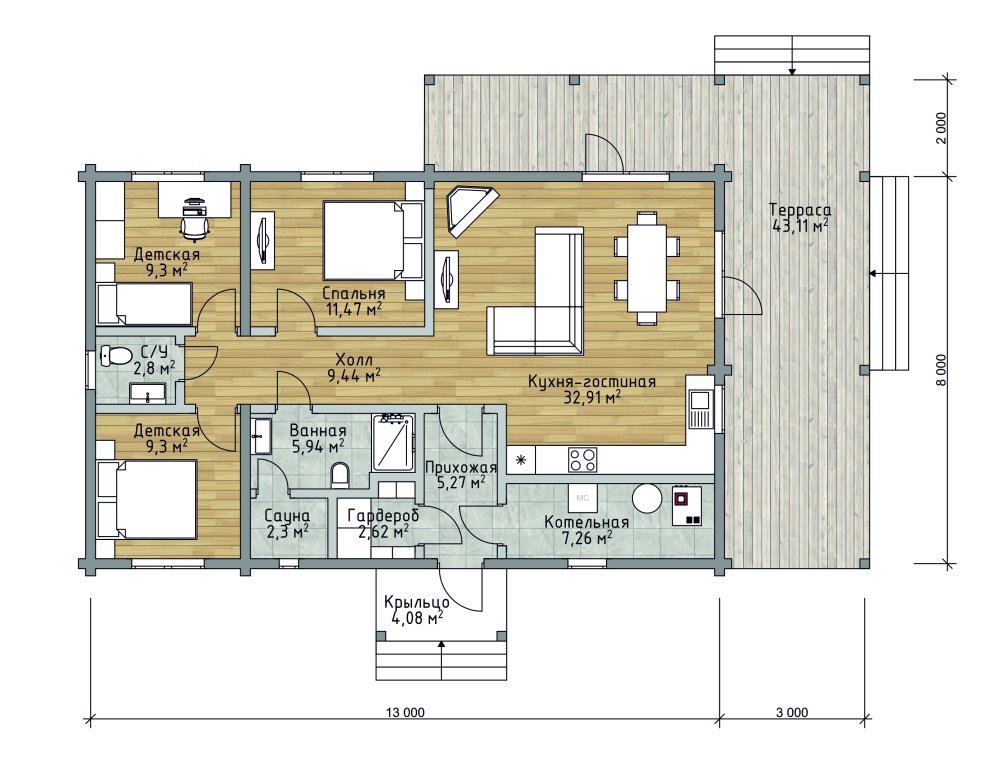 Расположившись среди живописной природы, этот одноэтажный дом манит своей простотой и гармонией с окружающей средой. Планировка в данном проекте продумана до мелочей. В данном проекте особое внимание уделено зоне отдыха и релаксации, в нем есть сауна и терраса с выходом из кухни гостинной.