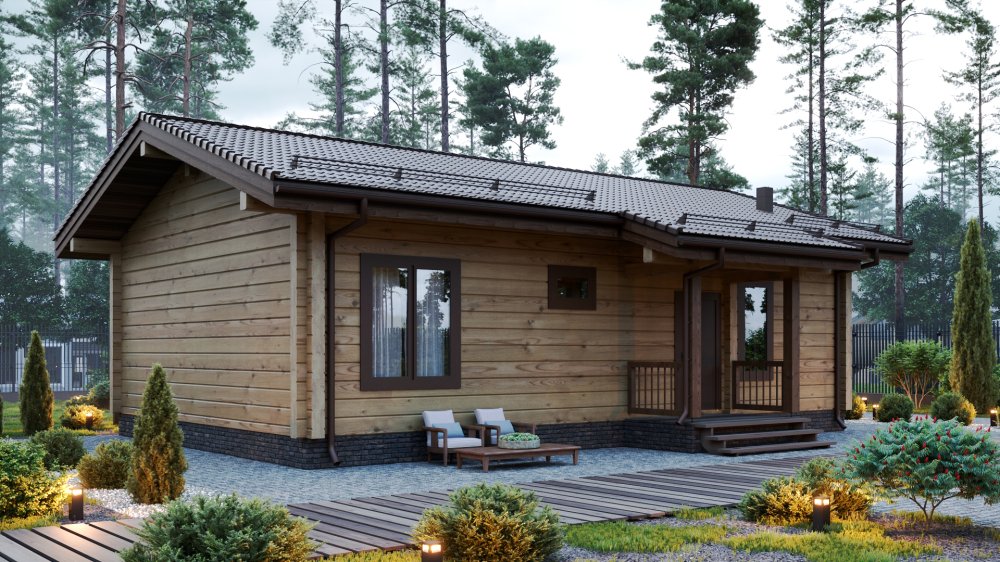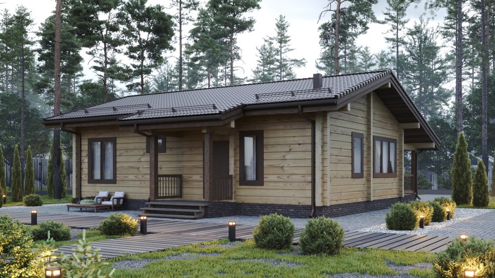 Одноэтажный деревянный дом, возведённый из благородного клееного бруса. Гладкая поверхность стен и выразительный рисунок волокон подчёркивают натуральную красоту дерева. Светлый фасад излучает теплоту и гостеприимство, идеально вписываясь в окружающий ландшафт. В данном проекте кухня-гостинная 26,5м2 с высокми потолками, три спальни и просторная терраса, которая приглашает наслаждаться видами природы и проводить время на свежем воздухе. Здесь удобно расположиться утром с чашечкой кофе или вечером с книгой в руках, слушая шелест листьев и наблюдая закат солнца.