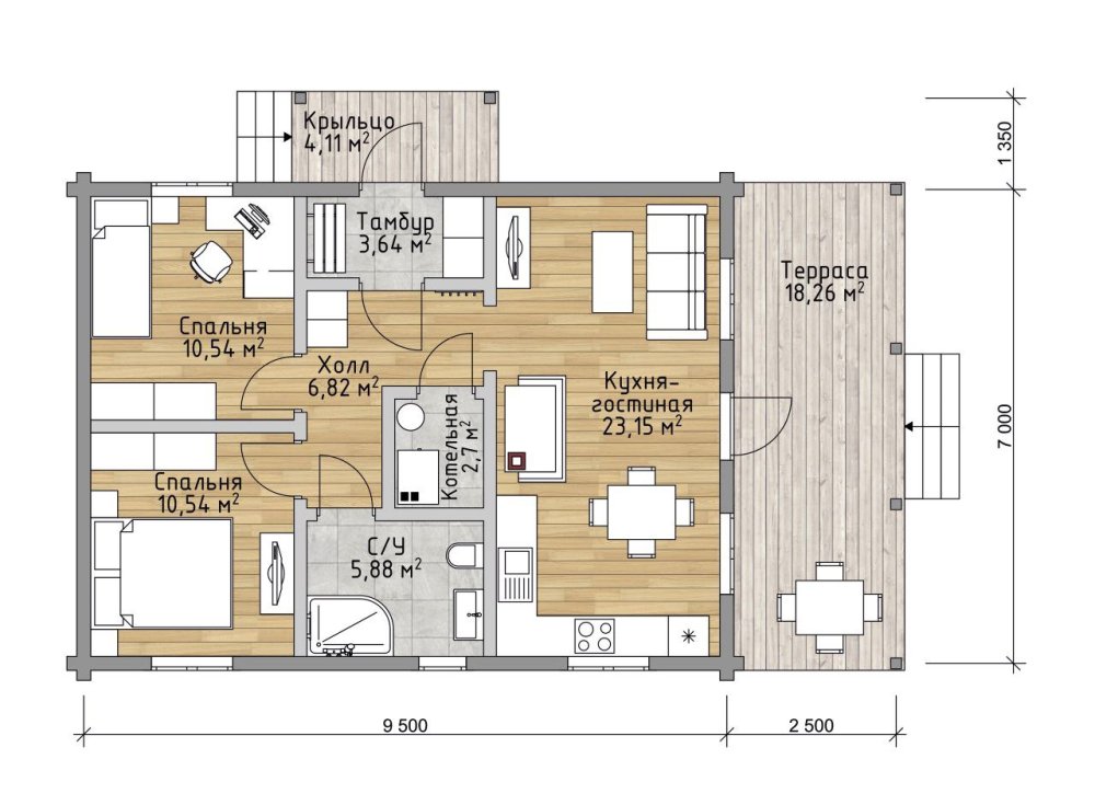 Одноэтажный дом площадью всего 85 квадратных метров удивительно функционально спланирован. Гостиная плавно перетекает в кухню, создавая просторное пространство для семейного отдыха и приёма гостей. Здесь царит атмосфера домашнего тепла и гармонии благодаря естественным оттенкам древесины и мягким природным материалам отделки. Комфорт обеспечат две светлые спальни, каждая из которых обладает индивидуальностью и возможностью создать личное пространство для каждого члена семьи. Особое очарование дому придаёт открытая терраса куда попадаешь из кухни-гостинной, идеальное место для завтраков на свежем воздухе или вечерних посиделок с чашечкой ароматного чая. Такой дом станет прекрасным выбором для тех, кто мечтает о тихой семейной гавани вдали от городской суеты, одновременно оставаясь достаточно комфортным и современным, чтобы обеспечить высокий уровень комфорта своим владельцам.
