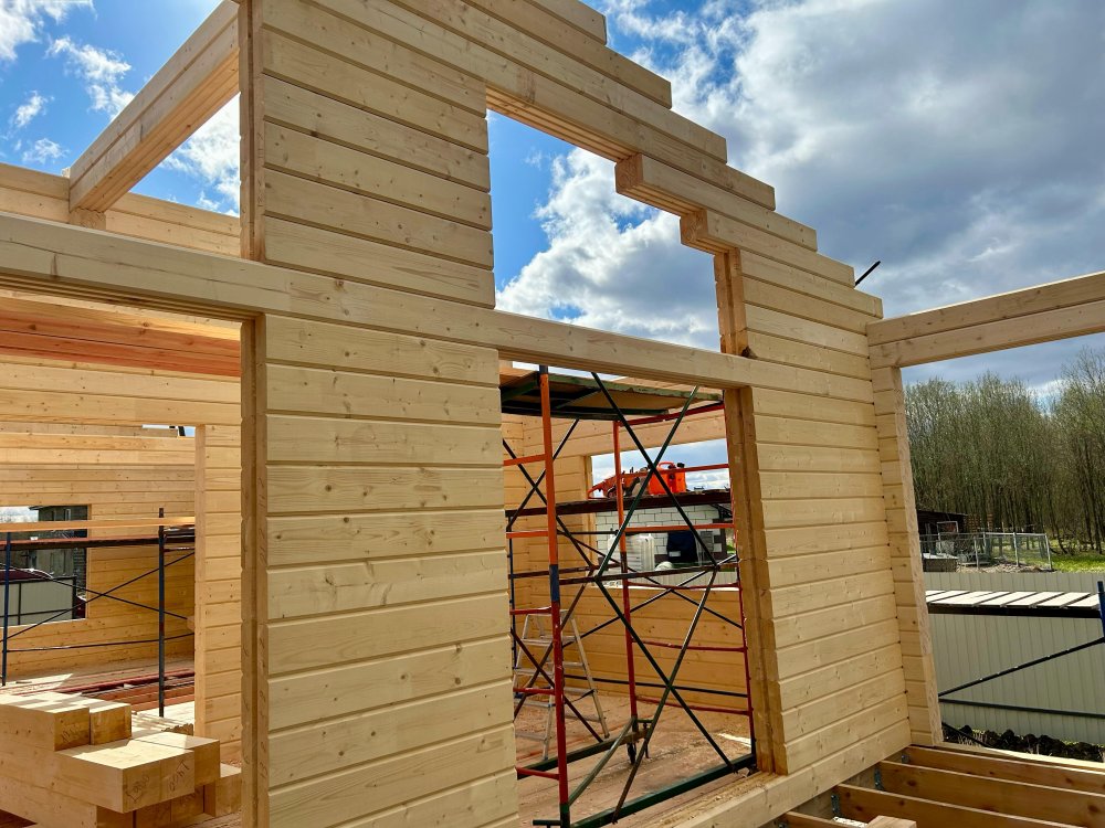 На прошлой неделе на строительной площадке под Череповцом Закончили возведение стен и смонтировали кровельную систему. В качестве покрытия выбрана металлочерепица в покрытии Drap. Стропила – доска камерной сушки строганная 45х195мм. Супердифузионная мембрана Protect. Контр брусок строганный 45х45 мм. Обрешетка – строганная доска 20х145 мм. Финишное покрытие металлочерепица Grandline 0,5 mm. Кровля двускатная площадь 200 м2.