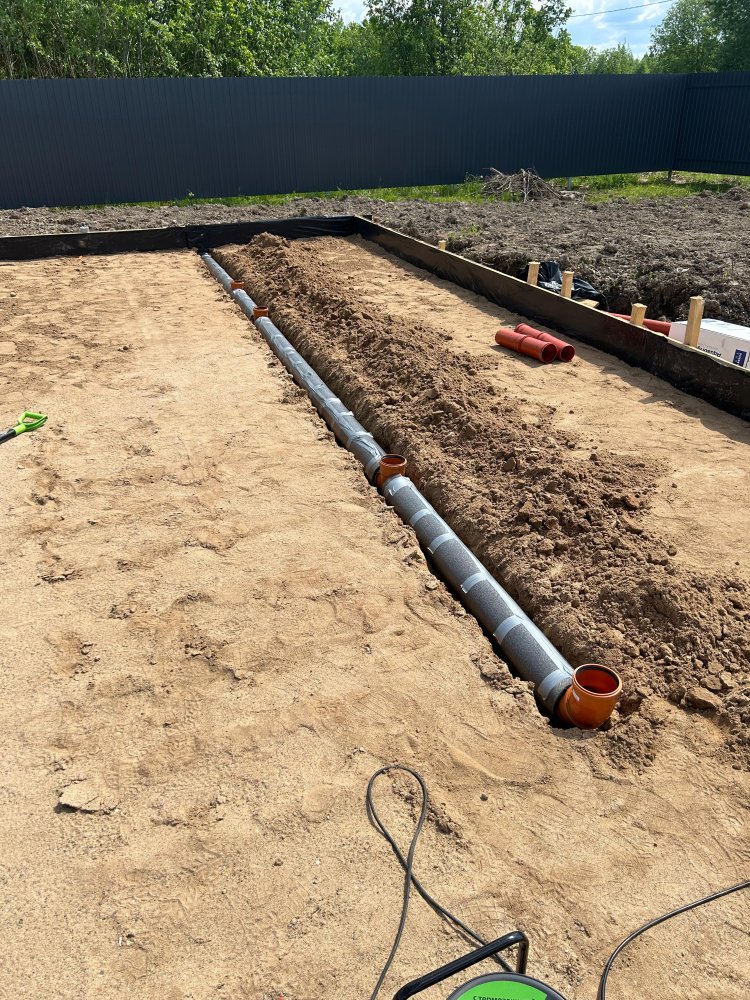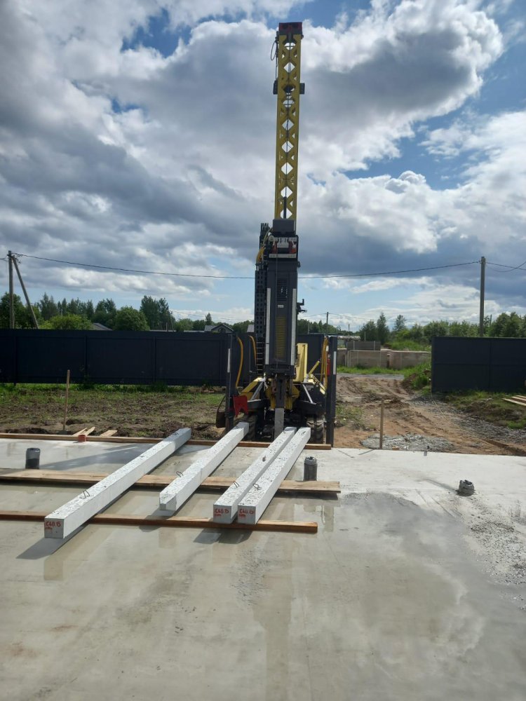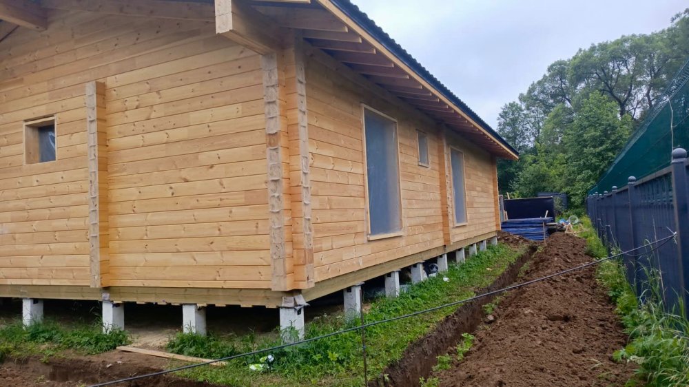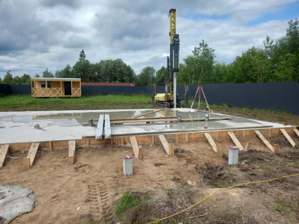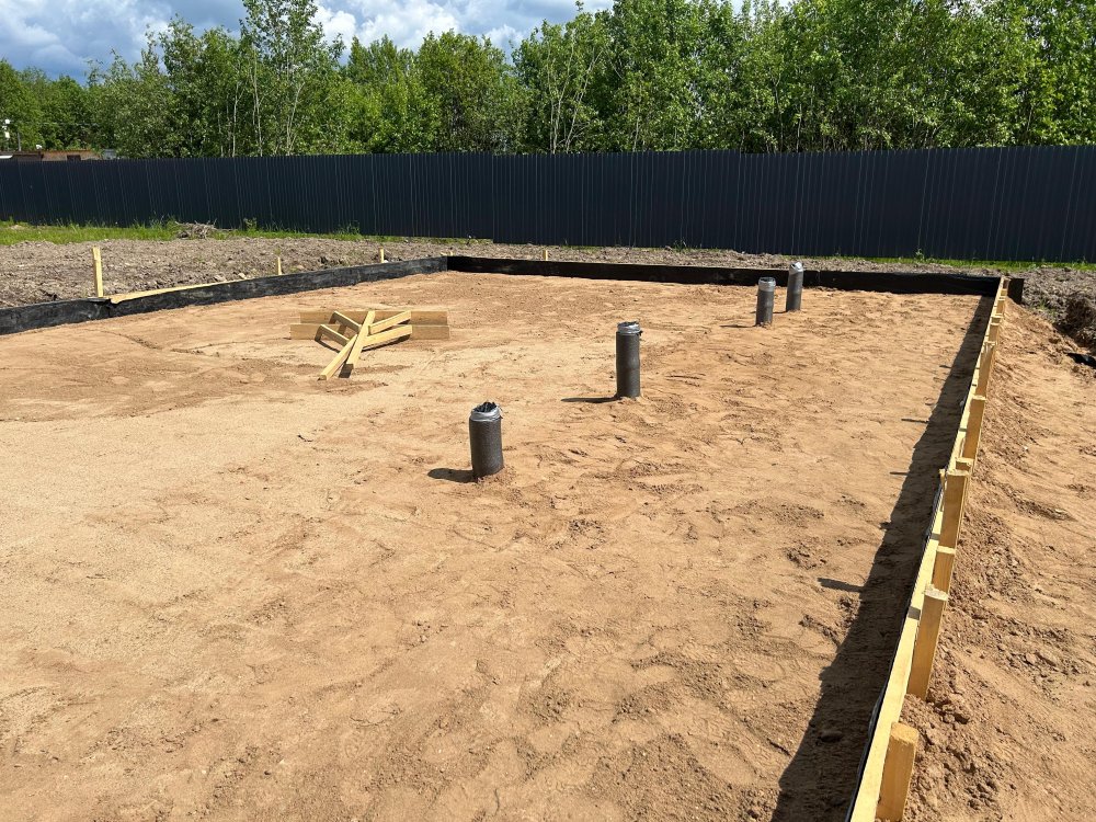 В деревне Борисово Череповецкого района уже заложен комбинированный фундамент под одноэтажный дом из клееного бруса, сечением 190hх205mm для круглогодичного проживания по индивидуальному проекту. Основанием для дома будет служить плита, а под террасу и крыльцо забили железобетонные сваи. Кстати, для возведения комбинированного фундамента очень важно еще на этапе проектирования строго рассчитать глубину забивки свай и обустройства плитного фундамента с учетом типа и особенностей грунта, рельефа участка, чтобы в процессе эксплуатации дома не возникло перепада высот. При заливке плиты предусмотрительно закладываем гильзы под ввод воды и электричества и канализации.