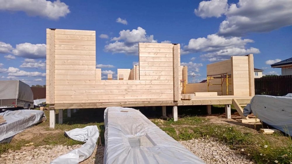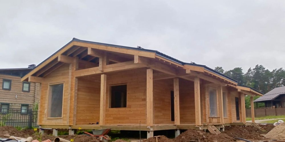 В Подмосковье в Ступинском районе возводим одноэтажный дом 112,5 м. кв. в коттеджном поселке Shelkovo Village. Сечение клееного бруса выбрано 190х164 мм, проект дома разработал заказчик.